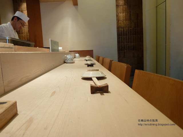 早在香港已經托朋友致電訂好位子,準時八時到達,店內幾乎是自己包場,相當有貴賓的感覺,或許有人會覺得有點孤寂,但這種環境就正合我心意,可以靜心品賞師傅為自己製作的每道料理。